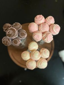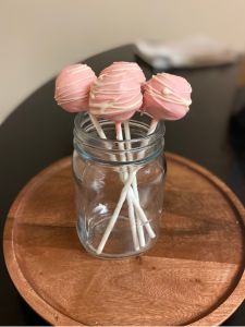 1. Follow the steps above for forming, chilling and decorating your cake pops. I decorated my strawberry cream cheese ones with pink melting chocolate on the outside and a white chocolate drizzle.