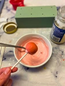 1. **Coat with Chocolate:** Dip each cake pop into the melted chocolate, allowing any excess to drip off. I like to add a bit of coconut oil to my melting chocolate. It helps the excess chocolate slide off the cake pops and makes the process go a little faster. You don’t want your chocolate to be watery! I usually add a teaspoon of coconut oil at most.