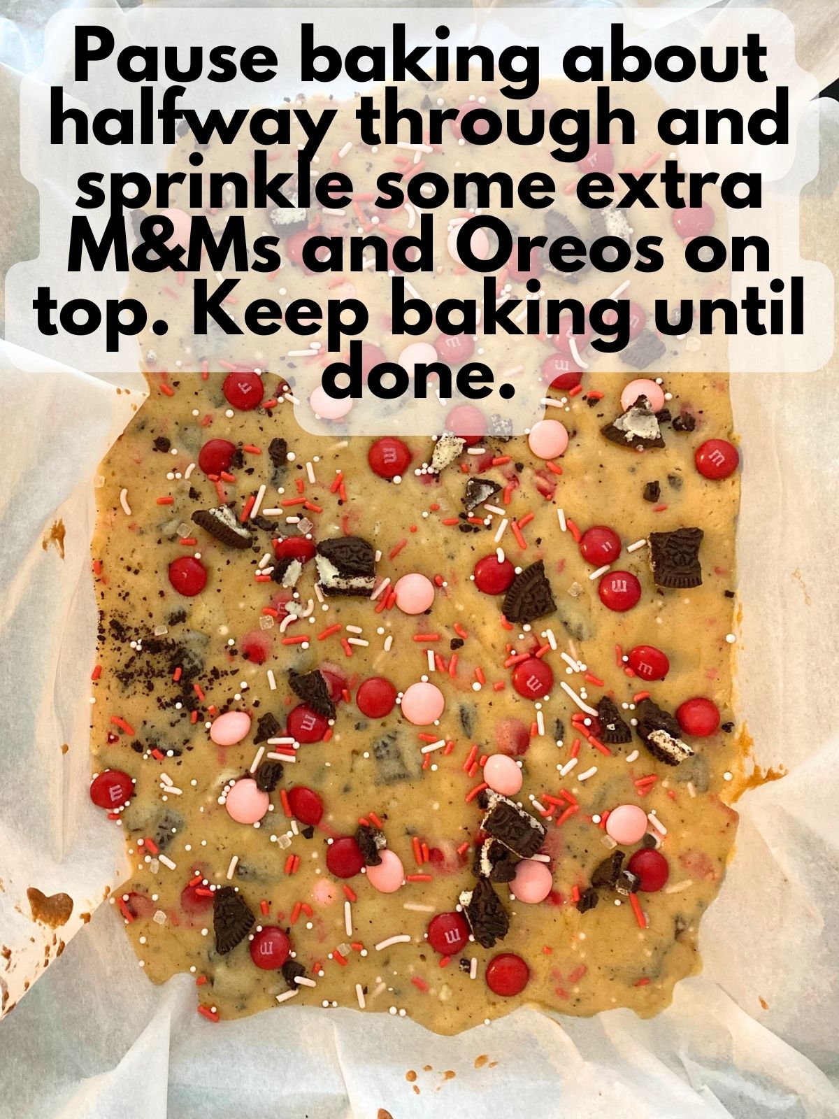 - Bake for 10 to 15 minutes, just until the top is starting to set but is still soft. Remove the pan from the oven and quickly scatter the remaining M&M’s, sprinkles, and chopped Oreos over the surface.