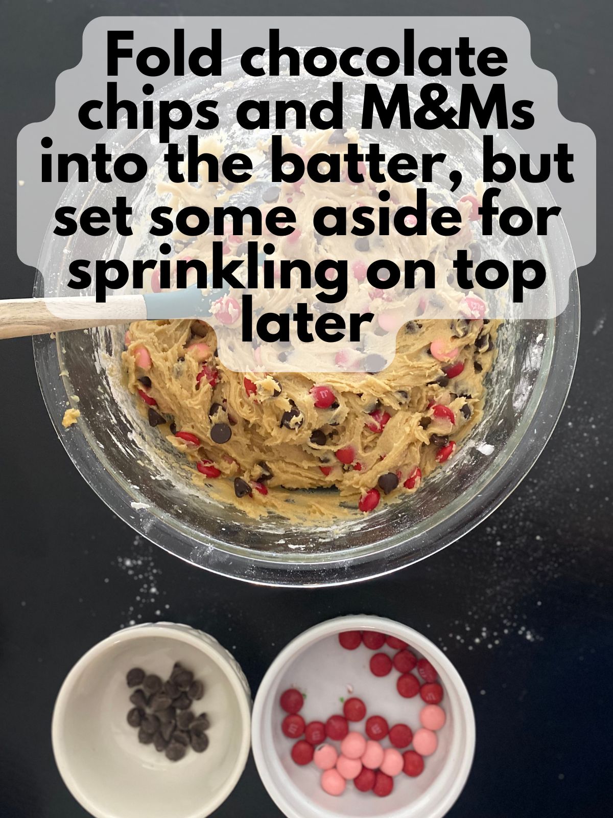5. Fold in chocolate chips and M&Ms, reserving a handful for topping.