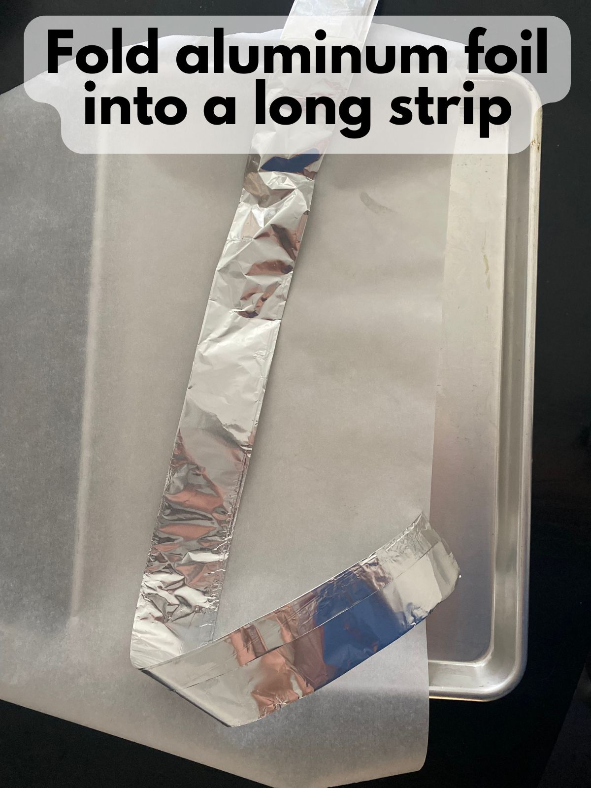 2. Create a heart mold with folded heavy-duty foil strips shaped into a heart. I did this by folding a long piece of aluminum foil into a strip that was about 2 inches tall. Then, I made a “tape” piece of aluminum foil to “tape” the ends of the strip together to make a big loop. Finally, I bent the loop into the shape of a heart.