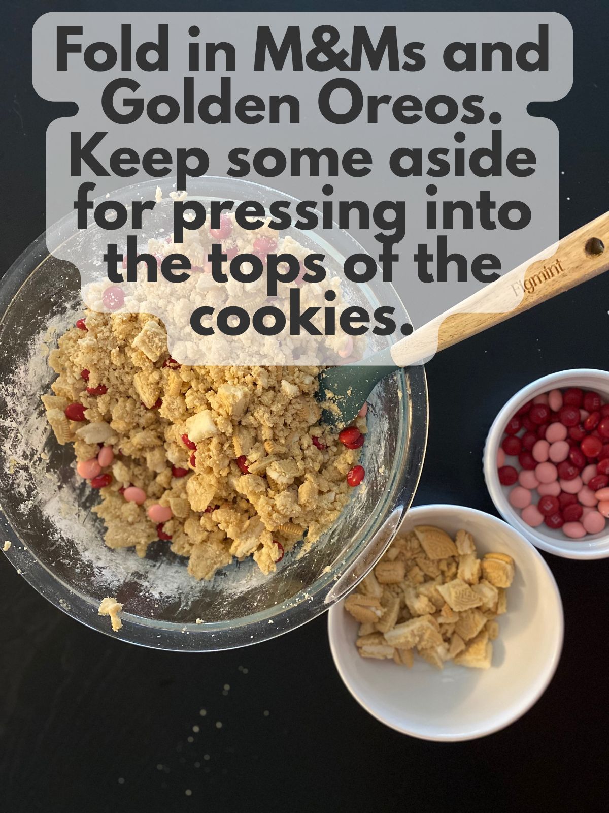 6. Fold in mix-ins – Stir in chopped Golden Oreos and M&Ms, reserving a handful to press on top. You can chill the dough for 30 minutes if you want thicker cookies, but you can also bake immediately.