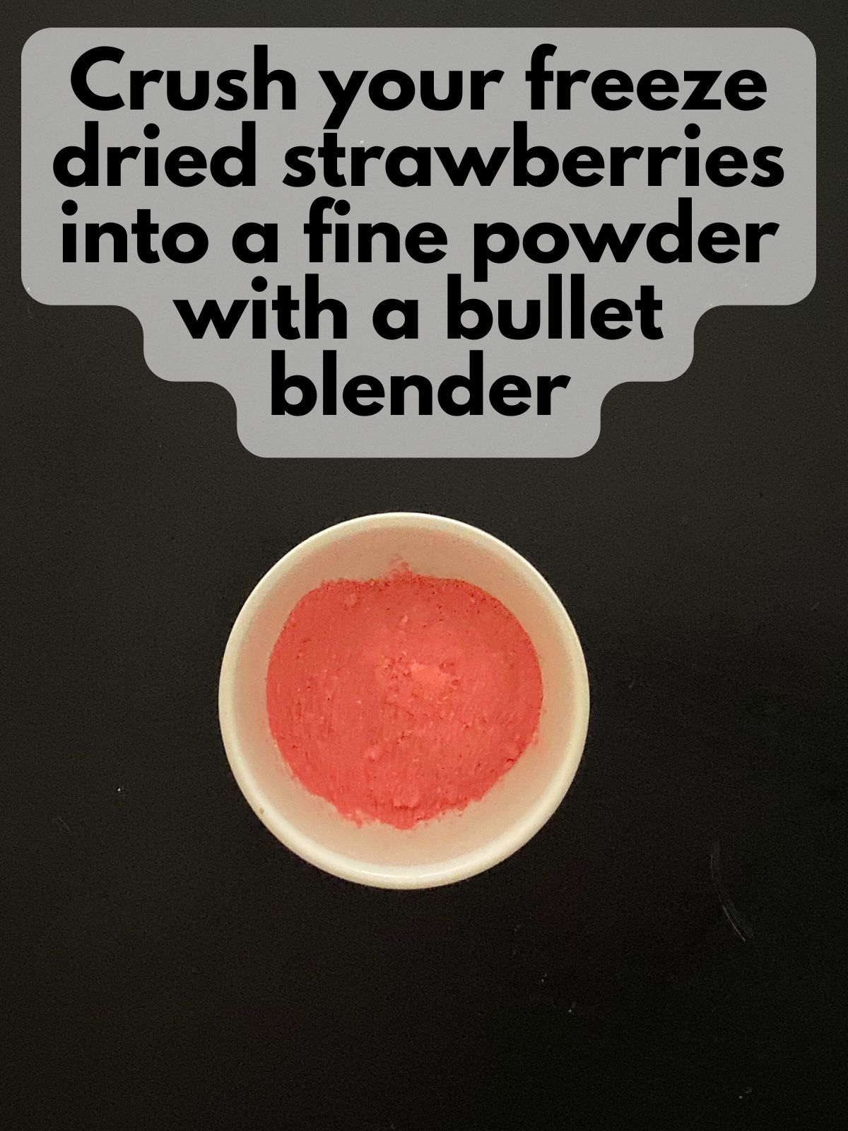 - Crush your freeze dried strawberries into a fine powder. You can use a bullet blender, or put them in a zip top bag and crush them with a rolling pin (the bullet blender method is much easier!)