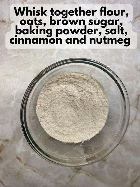 - In a large bowl, combine the flour, oats, brown sugar, baking powder, cinnamon, nutmeg, and salt.