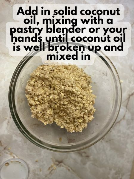 – Add the solid coconut oil to the dry ingredients. Use a pastry cutter or fork (or your hands! I like to just use my hands) to cut the coconut oil into the dry mixture until it resembles coarse crumbs.