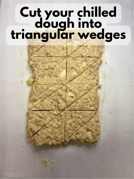 -Cut your chilled, firmed-up dough into triangular wedges. Transfer the wedges to a clean cookie sheet lined with parchment paper.