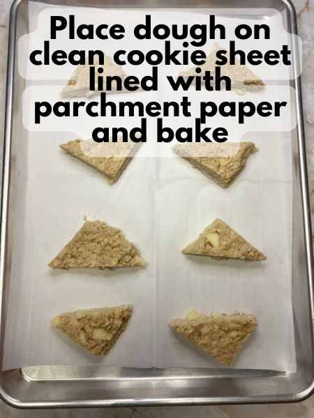 - Turn the dough out onto a clean surface (I use a cookie sheet lined with parchment paper) and pat it into a rectangle. Some people like to shape their scones into circles, and that’s fine too!
