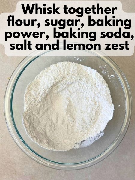 3. In a large mixing bowl, whisk together the flour, sugar, baking powder, baking soda, salt, and lemon zest.