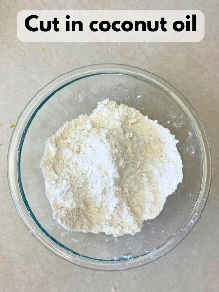 - Add the solid coconut oil to the dry ingredients. Use a pastry cutter or your fingertips to work the coconut oil into the flour mixture until it there aren’t any large chunks of coconut oil any more and it’s pretty well incorporated. Some small chunks of coconut oil are okay.