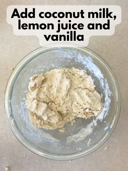 4. Add the solid coconut oil to the dry ingredients. Use a pastry cutter or your fingertips to work the coconut oil into the flour mixture until it there aren’t any large chunks of coconut oil any more and it’s pretty well incorporated. Some small chunks of coconut oil are ckay.