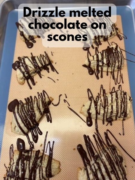 11. Optional: Melt about ⅓ cup of dairy-free chocolate chips and teaspoon of coconut oil in the microwave. Microwave in 30 second spurts, and stir in between until you have a smooth melted chocolate. Drizzle melted chocolate over the top of your scones.