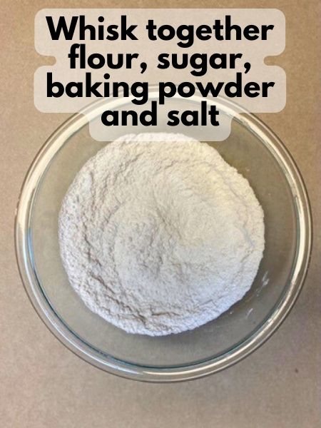 • In a large mixing bowl, whisk together the flour, sugar, baking powder, and salt.