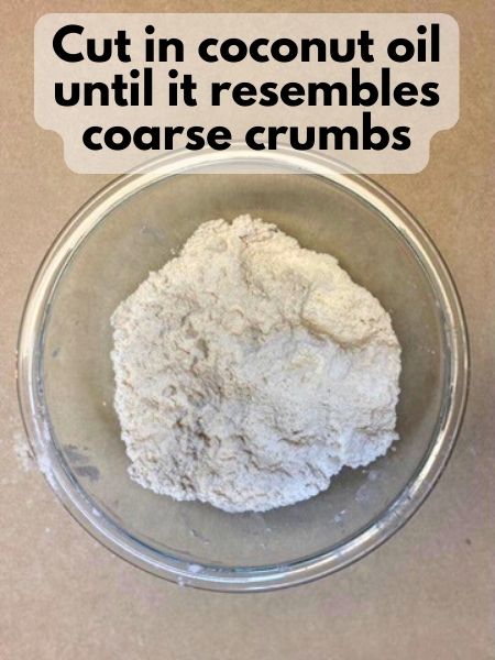 • Add the coconut oil to the dry ingredients. Use a pastry cutter or your fingers to work the butter into the flour mixture until it resembles coarse crumbs. You just want to break up the coconut oil pretty well so that there are no large chunks and it’s well blended in with the dry ingredients.