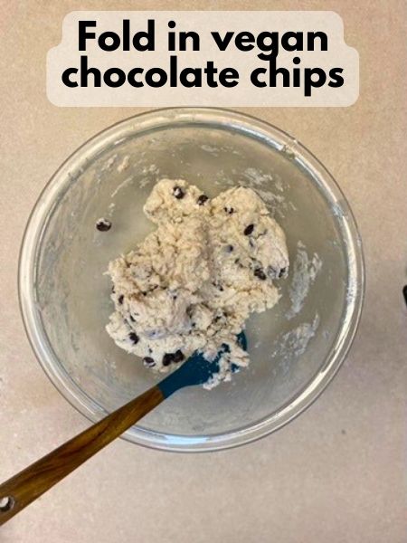 • Gently fold in the dairy-free chocolate chips until evenly distributed throughout the dough. Be careful not to overmix.