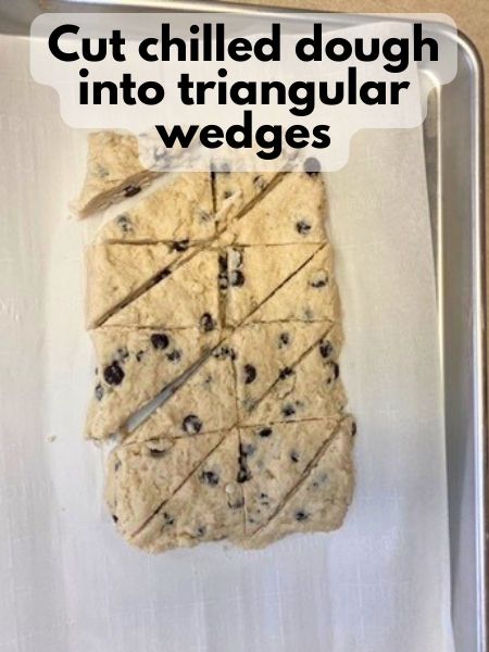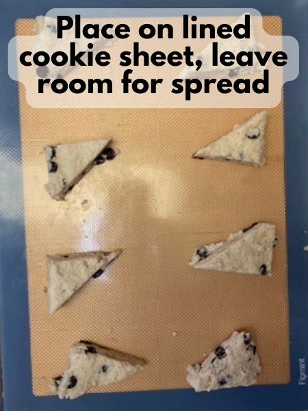 • Cut your scone dough into triangular wedges. Transfer the scones to the prepared baking sheet (with clean parchment paper or a silicone baking mat!), leaving some space between each one.