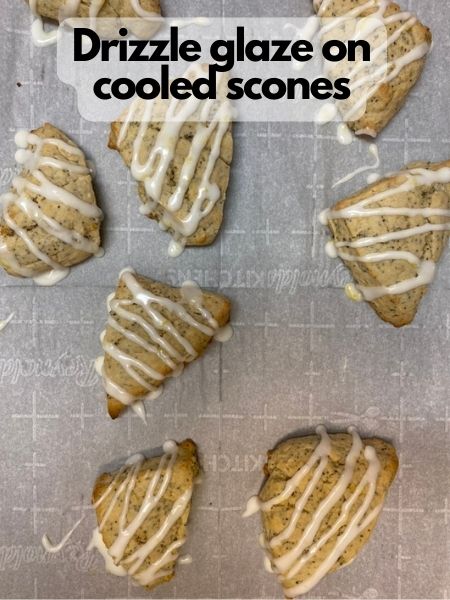 - After your scones have cooled, whisk together all of your glaze ingredients until smooth. Drizzle lemon glaze over vegan lemon poppy seed scones.