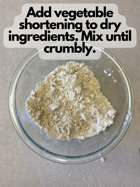 - Add the vegetable shortening to the dry ingredients and use a pastry cutter or your fingers to cut the vegetable shortening into the flour until the mixture resembles coarse crumbs.