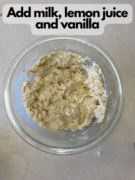 4. Pour the oat milk, lemon juice and vanilla into the dry ingredients and stir until just combined. Be careful not to overmix.