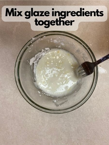 11. Whisk together your glaze ingredients in a small bowl. You’ll need one cup of powdered sugar, two tablespoons of fresh lemon juice, and a teaspoon of lemon zest for that extra kick.