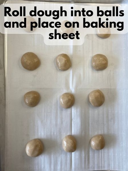 – Scoop tablespoon-sized portions of dough and roll them into balls. Place the balls onto the prepared baking sheet.