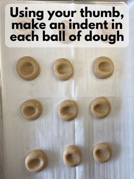 – Using your thumb or the back of a spoon, make an indentation in the center of each cookie.