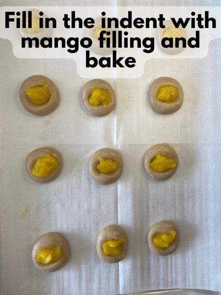 8. Fill the Cookies: Fill each indentation with a small amount of the mango filling.