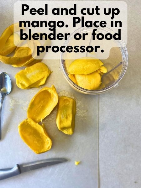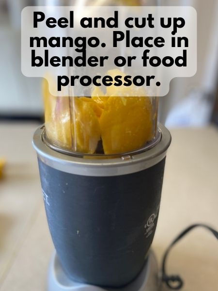 - Peel and cut mangoes into chunks. Place mango in blender or food processor and puree until smooth.