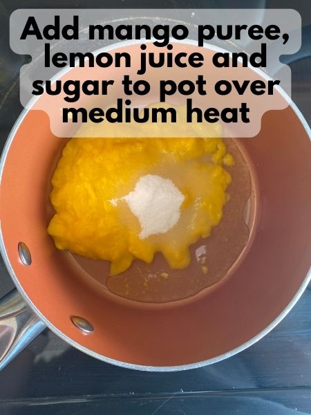 In a small saucepan, combine the mango puree, sugar, and lemon juice. Cook over medium heat until the mixture starts to simmer.