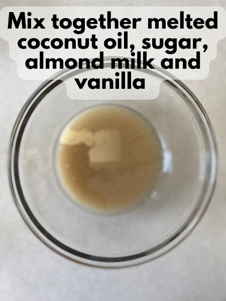 - In a large bowl, combine the melted coconut oil, sugar, almond milk, and vanilla extract. Mix until well combined.