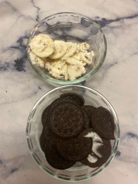 - Scrape the filling out of 12 Double Stuf Oreos. Keep the filling in one bowl and the cookies separate in another bowl.