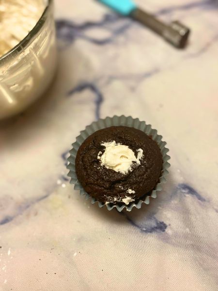 – Fill a piping bag with the Oreo creme filling and pipe it into each cupcake. You can also use a baby spoon if you have one on hand, too. If it looks a little sloppy, that’s okay! You’re going to put frosting over it, anyway.
