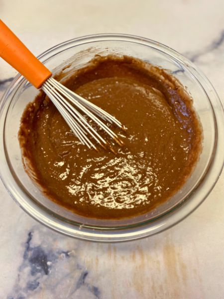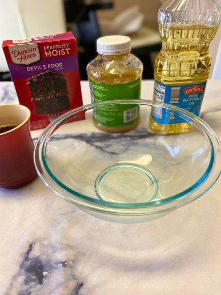 - Prepare your chocolate cake mix according to the instructions. I use 1/2 cup of applesauce to replace eggs and coffee to replace any water.